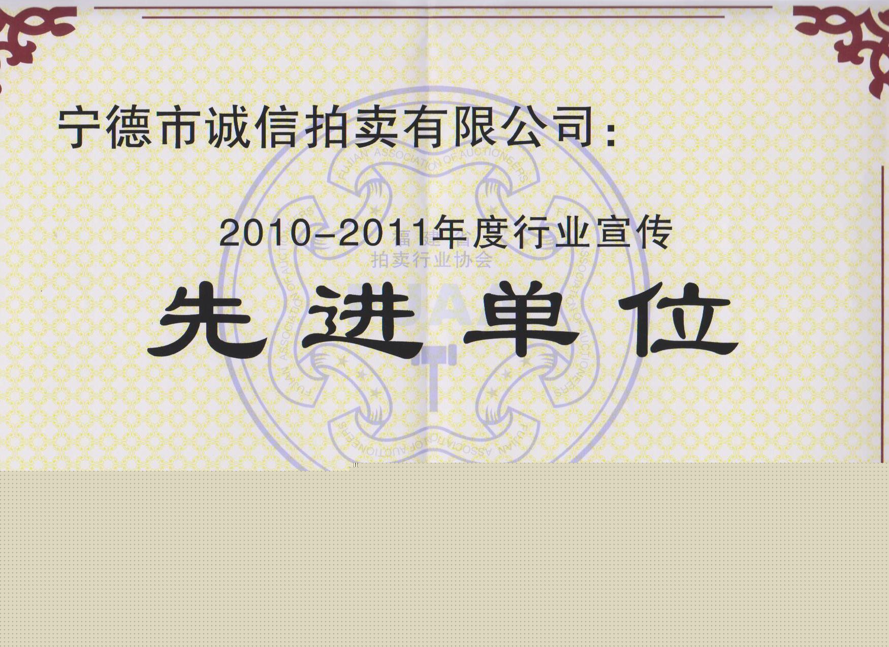 拍卖行业宣传先进单位证书